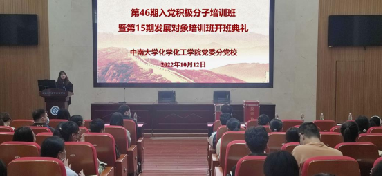 2022年10月12日下午,必赢626net入口首页党委分党校第46期入党积极分子培训班暨第15期发展对象培训班开班典礼在新校区化学楼133报告厅举行。院党委副书记、分党校副校长刘有才出席并致辞,学工办副主任白丹妮、本科生应化第二党支部书记赵元超、发展对象培训班班导师于悦凡以及培训班全体学员参加。开班典礼由入党积极分子培训班班导师胡雨琪主持。