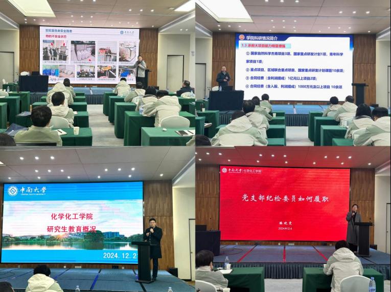 副院长阳华从实验室安全方面入手,介绍了学院安全管理工作;副院长刘广义介绍了学院科研情况并详细解读了近期部分科研项目申请;副院长宋相志介绍了学院研究生教育概况;副书记滕晓雯介绍了学院纪检工作,并就党支部纪检委员如何履职作相关报告。