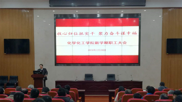 2月24日下午,必赢626net入口首页在新校区化学楼133报告厅召开2018年上半年新学期教职工大会。院领导班子及全体教职工参加会议。院党委书记马跃如、院长钟宏、副院长刘又年和副院长卢红梅发表讲话。院党委副书记刘有才主持会议。