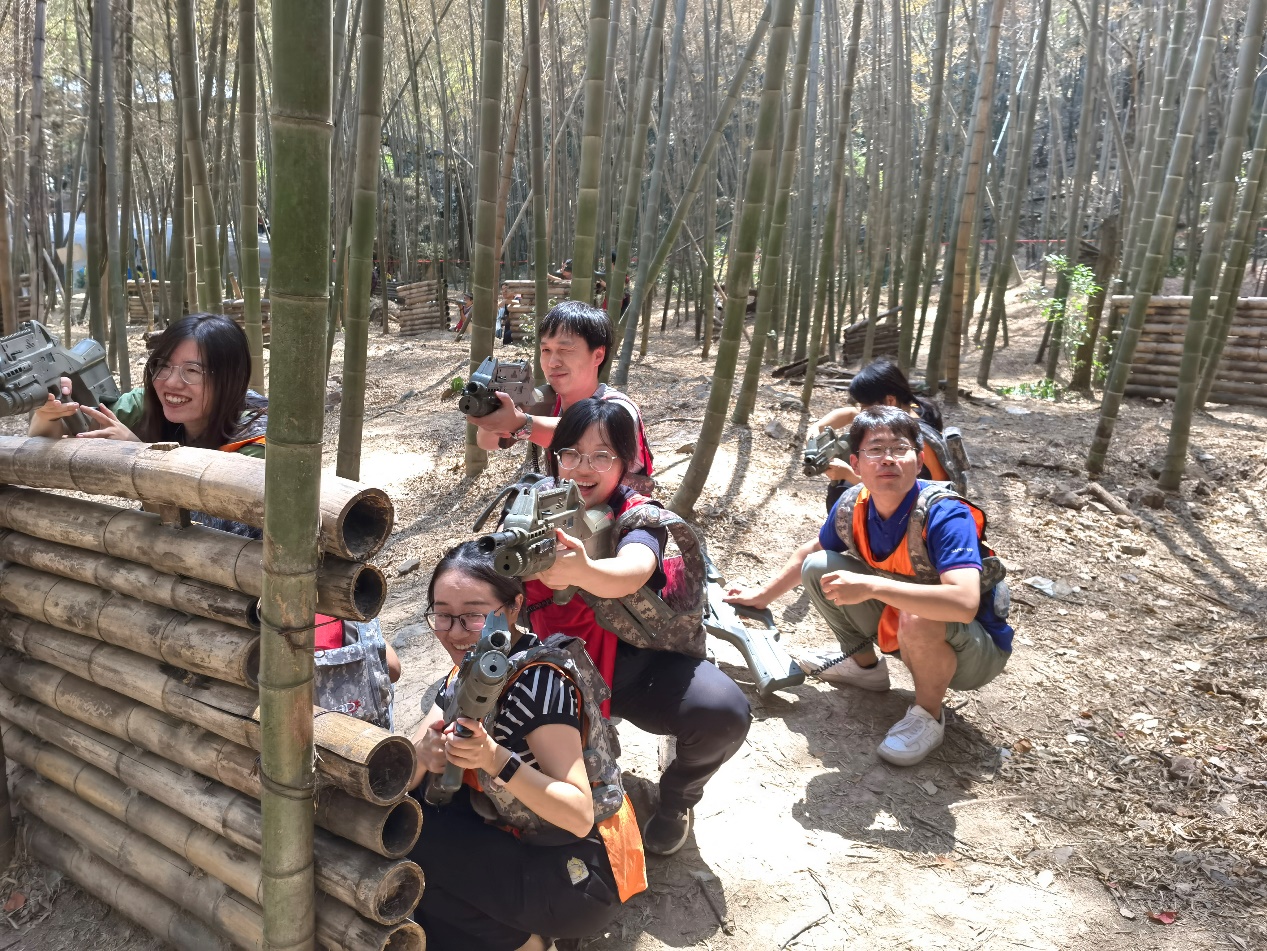 接着,老师们体验了真人CS镭战。四个队伍被并成两个队伍,分别是黄蓝联盟和红橙CP。 “战友们”穿上武装,扛起冲锋枪,在竹林中开展决战。战斗共进行了两轮,异常激烈,老师们忘却了年龄和身份,化身为战士,利用地势和掩体,和队友并肩作战,发起冲锋。