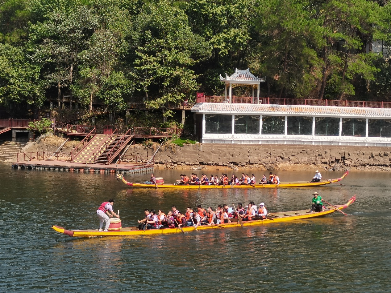 下午,老师们体验了赛龙舟的乐趣。秋高气爽,艳阳高战,波光粼粼的湖面上三只龙舟因老师们的到来变成了在湖水中穿行嬉戏的黄龙。老师们击着行船鼓,喊着劳动号子,齐力挥舞着船桨,给澄净的湖水留下了一道道白色涟漪和一阵阵欢声笑语。
