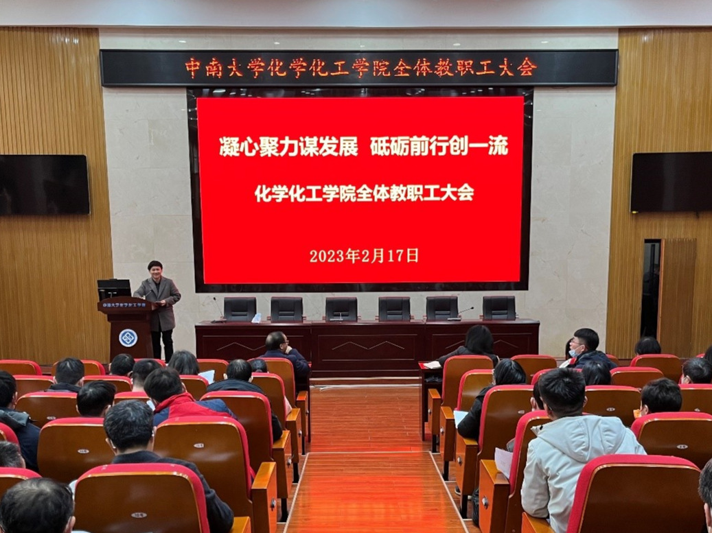 紧接着会议进入第二项议程,刘又年院长作学院年度工作报告和2023年发展规划,又年院长总结了学院2022年在党建工作、学科建设、队伍建设、人才培养、科学研究等方面取得的成果,学院发展态势稳中向好,但是在高层次人才尤其是领军人才方面依旧存在不足,接下来学院要继续围绕“大平台、大团队、大项目、大成果”的科研理念,立足国家需要,攻关技术难题,同时紧密结合化工学科发展规划进一步开展学院工作。
