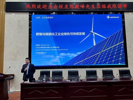 10月19日上午,杰出校友、万华化学集团股份有限公司高级副总裁陈毅峰先生在化学楼133报告厅作题为“数智化赋能化工企业绿色可持续发展”的报告。活动吸引了近二百名师生参加,必赢626net入口首页党委书记刘有才主持活动。