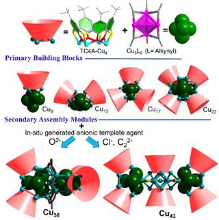 利用铜基催化剂进行电化学还原CO₂反应(CO₂RR)以生产高附加值的烃类燃料,是实现CO₂资源利用的有效手段。然而,铜基纳米材料的复杂表面结构阻碍了对CO₂RR反应机理的深入研究。铜纳米团簇作为一种新兴晶态铜基材料,其精确结构信息有助于在原子水平上调控催化剂活性,并提供研究材料结构与催化性能之间联系的平台。但低价铜纳米团簇不稳定,在严苛电催化条件下结构易破碎分解,因而高核铜纳米簇在电催化CO₂RR中的研究十分有限。