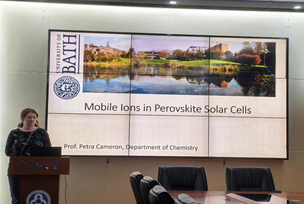 2024年11月4日下午16:00于中南大学新校区化学楼129报告厅举办了题为“Mobile Ions in Perovskite Solar Cells”的学术讲座,报告人是巴斯大学Petra Jane Cameron教授报告。报告会由纪效波教授主持,来自全院相关学科的师生们聆听了Petra Jane Cameron老师的精彩讲座。