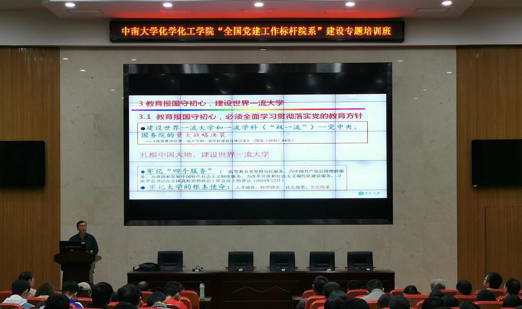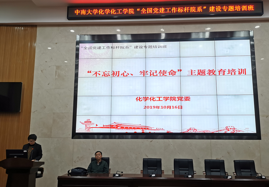 为进一步增强学院党员师生“不忘初心、牢记使命”主题教育学习成效,高质量推进党建标杆建设工作,10月16日,学院党委在化学楼133报告厅举办第五期“全国党建工作标杆院系”建设培训班。校党委常委、常务副校长胡岳华为必赢626net入口首页师生作“不忘初心、牢记使命”主题教育培训。院班子成员刘又年、纪效波、阳华、刘广义,全体教职工党员、学生党员代表以及部分入党积极分子参加学习。培训会由院党委委员、副院长卢红梅主持。