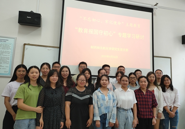 根据校院两级党委关于开展“不忘初心、牢记使命”主题教育的部署要求,制药和无机化学研究生党支部于9月26日在化学楼123教室开展了“教育报国守初心”专题学习研讨主题党日活动。研讨活动由支部书记白丹妮同志主持。