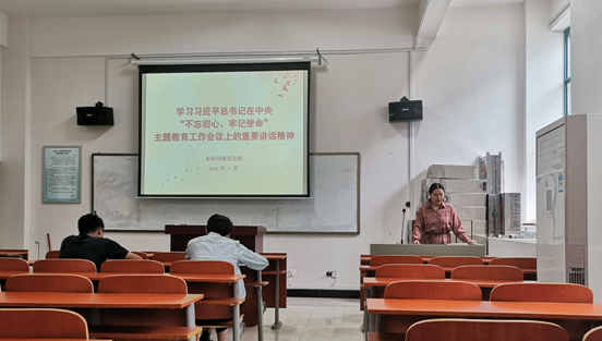 为深入学习习近平新时代中国特色社会主义思想,强化理论武装,贯彻落实党中央对于“不忘初心、牢记使命”主题教育的总要求和目标任务,引导支部党员真正做到学思用贯通、知信行统一,2019年7月3日上午,本科2018级支部书记白丹妮同志在化学楼123教室以“学习习近平总书记在中央‘不忘初心、牢记使命’主题教育工作会议上的重要讲话精神”为主题,为全体党员上了一节生动的党课。