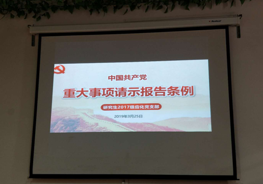 3月25日下午14:30,研究生2017级应化党支部在化学楼132党员活动室开展专题学习主题党日活动,集体学习了《中国共产党重大事项请示报告条例》《中共中央关于加强党的政治建设的意见》《2019年政府工作报告》和全省教育大会精神。支部全体党员参加会议,会议由支部书记何海传主持。