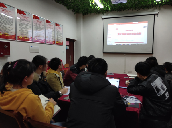 3月22日晚,研究生2018级应化党支部在化学楼132党员活动室开展了3月份主题党日活动,支部成员集中学习了全省教育大会精神、《中共中央关于加强党的政治建设的意见》(以下简称《意见》)和《中国共产党重大事项请示报告条例》(以下简称《条例》)和《2019年政府工作报告》解读等内容,讨论了“两会”热点问题。会议由支部书记李思哲主持。