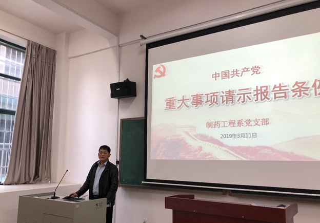 3月11日下午,制药工程系党支部在化学楼129教室开展3月份主题党日活动,支部成员集中学习《中共中央关于加强党的政治建设的意见》(以下简称《意见》)和《中国共产党重大事项请示报告条例》(以下简称《条例》),研究部署和贯彻落实相关要求。会议由支部书记钟世安主持,全体党员参加学习。