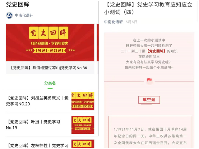 学院党委非常重视用网络平台传播党史,努力拓宽年轻人学习渠道,通过化语轩新媒体微信公众号开辟“党史回眸”专栏,每日推送党史大事件;开展“打卡建党百年”、“每日一课”线上学习和党史学习每月一次线上答题自测活动,同时,依托“红色化韵”优秀育人案例,开展线上红色电影配音大赛。学院还成立党史学习教育“红色讲师团”,组织20名优秀党员师生,以短视频和微党课的形式线上线下同步开展讲述具有重大历史意义的党史大事记。