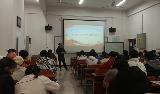 12月18日晚上19:00-20:10,联系支部的教师党支部书记唐俊涛老师在128教室以“党的十九届六中全会精神解读”为题讲授专题党课,硕士生应化与无机第一、第二支部全体党员参加学习。