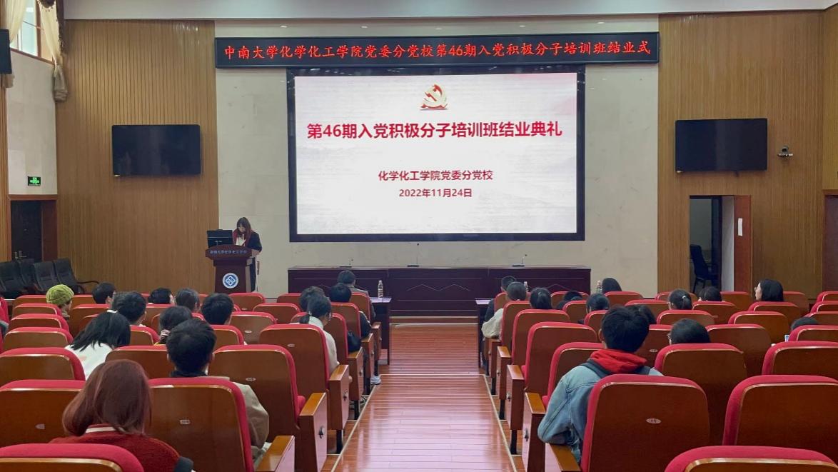 2022年11月24日中午,必赢626net入口首页党委分党校在化学楼133报告厅举行第46期入党积极分子培训班结业典礼。院党委书记、分党校校长刘有才出席并致辞。党委委员、专职组织员、分党校办公室主任李璞同志,院党委专职组织员汪菁垚同志及培训班全体学员参会。结业典礼由培训班班导师胡雨琪同志主持。