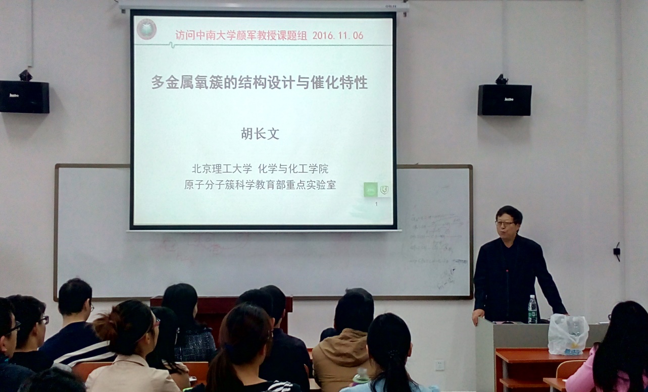 2016年11月06日上午9:30,新校区化学楼125室举办了主题为“多金属氧簇的结构设计与催化特性”的学术讲座,主讲人是北京理工大学化学院院长胡长文教授,本次报告会由必赢626net入口首页颜军教授主持。