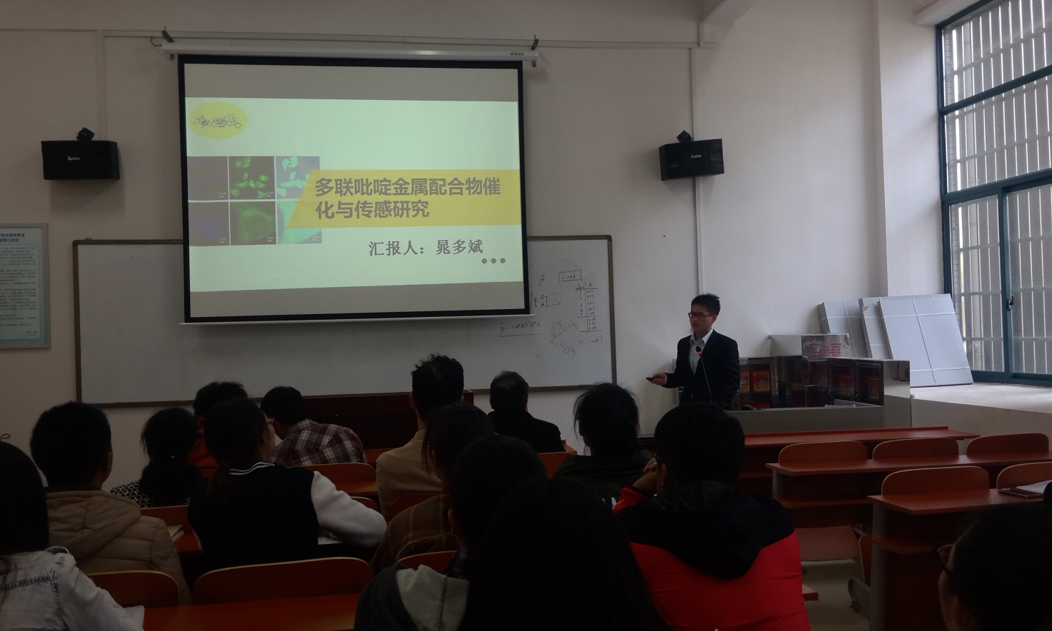 此次报告会,晁多斌博士主要给我们介绍了多联吡啶金属配合物在光催化以及传感两个方面的研究。首先从研究背景介绍了光催化的产氢、产氧、还原二氧化碳以及有机合成等几个体系,传感方面的荧光探针、化学传感以及生物传感等几个体系,但晁多斌博士说近三年主要的研究领域是在金属配合物(比如Ir3+)上,研究其在阴阳离子以及小分子检测上的应用,再者还研究了Ru/Cu配合物的需氧光催化反应。除此之外,晁多斌博士还详细给我们介绍了金属配合物在未来的整个研究计划,这在一定程度上给我们的研究提供一个良好的导向作用。同时,晁多斌博士还给我们介绍了一些投稿的经验,这对于我们以后投稿起到了至关重要的作用。