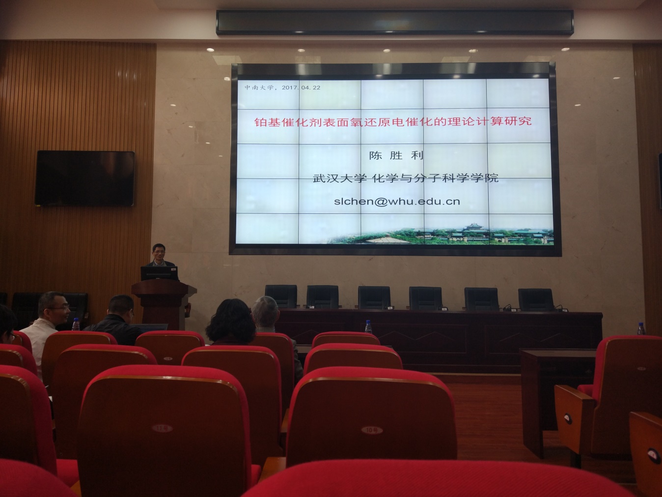 2017年4月22日上午10:30,新校区化学楼133报告厅举办了主题为“铂基催化剂表面氧还原电催化的理论计算研究”的学术讲座,主讲人是武汉大学珞珈学者特聘教授陈胜利,本次报告会由必赢626net入口首页向娟教授主持。