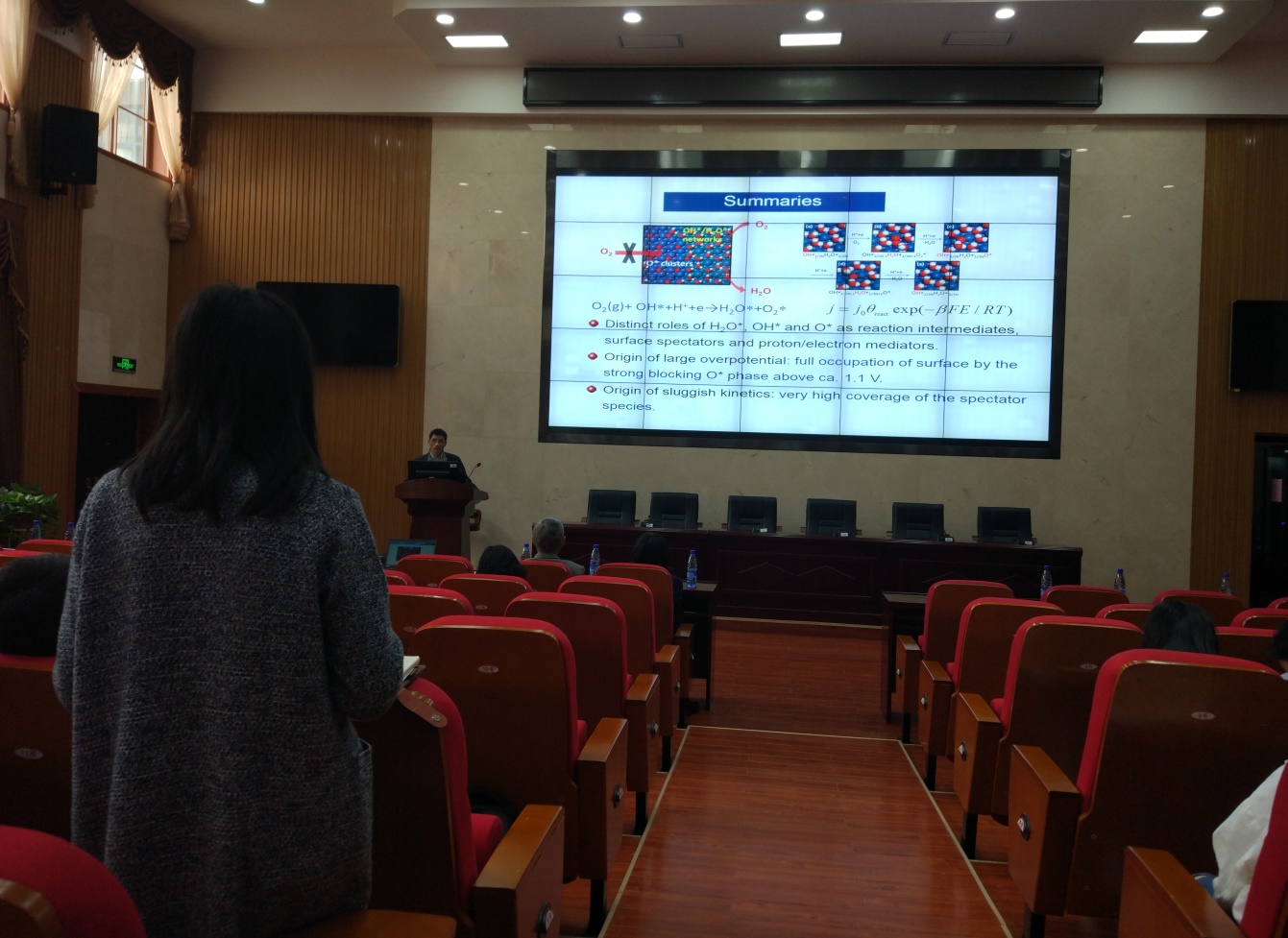 在此次报告会上,虽然基于理想模型体系的基础研究和基于组合化学的高通量材料筛选方法在很大程度上提高了催化剂的设计与筛选效率袁但单纯依赖实验技术的催化剂搜索的时效仍然很低且成本很高.近年来,建立在以密度泛函理论(DFT)为主的量子化学方法和高性能计算技术基础上的现代计算化学在功能材料的设计和高通量筛选中逐步得到应用.基于理论计算的催化剂设计筛选工作近期发展尤其迅速。陈教授为大家讲解了铂基催化剂表面氧还原电催化的理论计算的相关研究。