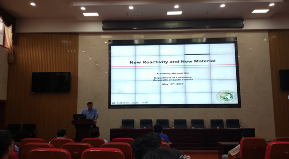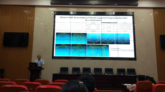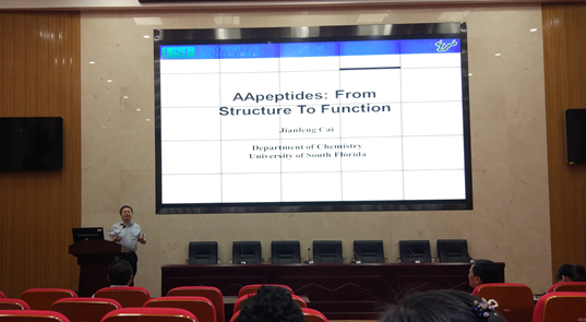 2017年5月19日下午15:00,新校区化学楼报告厅133室先后举办了主题为“Triazole-Au(I) complexes in promoting homogeneous gold catalysis: From stability to selectivity”、“Rational Design, Synthesis, and Chemical Biology Studies of Selective Inhibitors for Protein–Protein Interactions”、“Function Self-Assembly of Giant Supramolecules withIncreasing Complexity”以及“AApeptides: From Structure to Function”的四场学术讲座,主讲人是南佛罗里达大学的四位教授,他们分别是史晓东教授、季海涛教授、李霄鹏教授以及蔡健峰教授,本次报告会由必赢626net入口首页纪效波教授以及王平山教授主持。