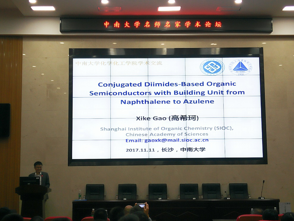 2017年11月11日下午16:00,新校区化学楼133报告厅举办了主题为“Conjugated Diimides-Based Organic Semiconductors with Building Unit from Naphthalene to Azulene”的学术讲座,主讲人是中国科学院有机化学研究所高希珂研究员,本次报告会由必赢626net入口首页宋相志教授主持。