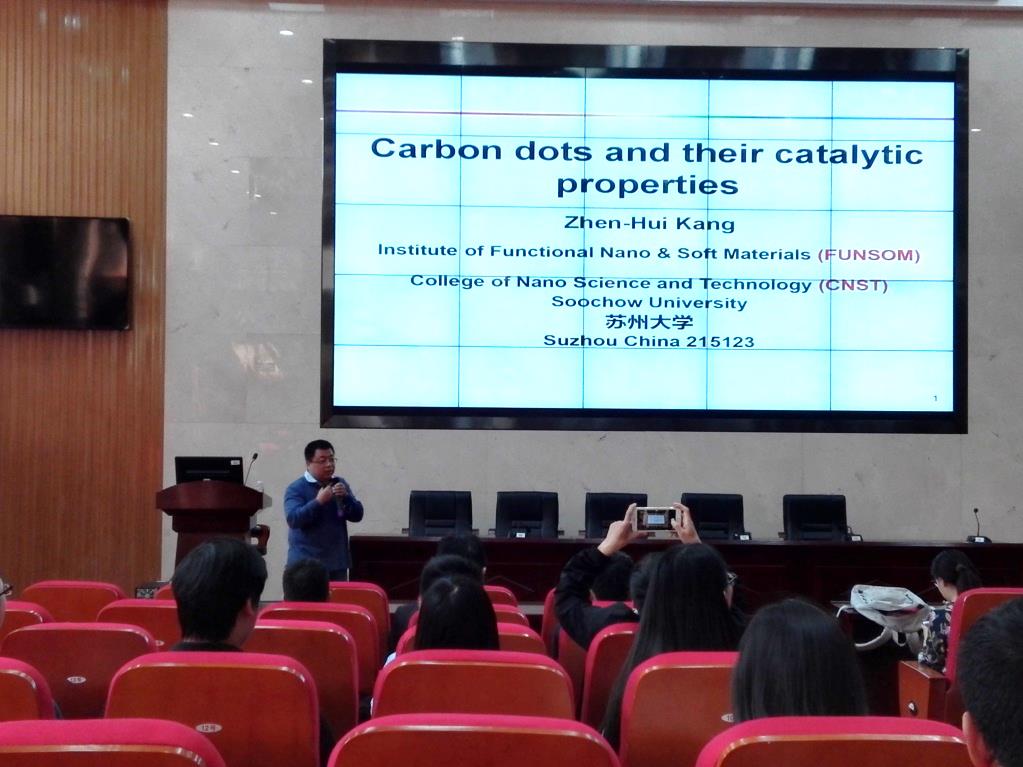 4月10日上午10:00,苏州大学康振辉教授应我校纪效波教授之邀在中南大学新校区化学楼133报告厅举办了题为“碳点的性质与催化应用”的学术讲座。报告人康振辉教授,就职于苏州大学,近年来主要从事量子点催化特性的研究。报告会由纪效波教授主持,来自全校相关学科的师生们聆听了康教授的精彩报告。