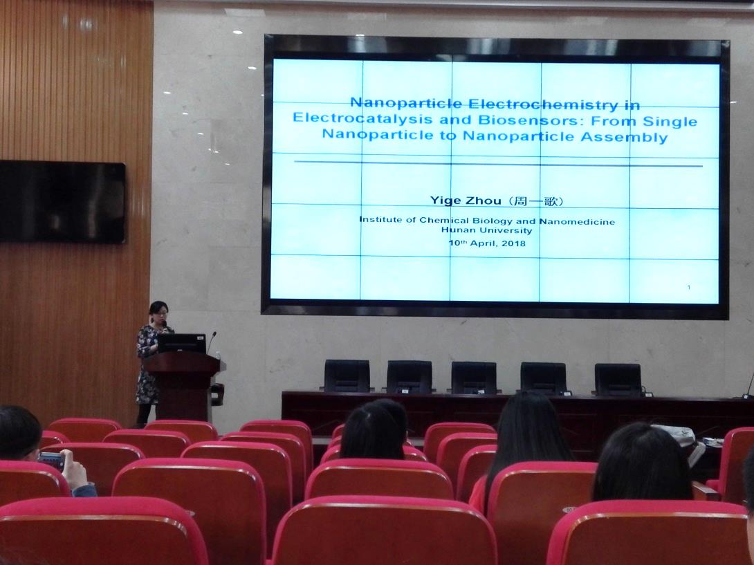 4月10日上午11:00,湖南大学周一歌教授在中南大学新校区化学楼133报告厅举办了题为“Nanoparticle Electrochemistry in Electrocatalysis and Bio-detection:From Single Nanoparticle to Nanoparticle Assembly”的学术讲座。报告人周一歌教授就职于湖南大学化学生物学与纳米医学研究所。报告会由纪效波教授主持,来自全校相关学科的师生们聆听了周教授的精彩报告。