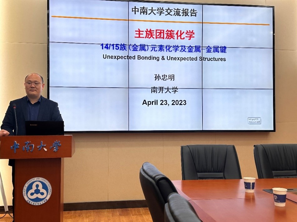 2023年4月23日下午,在中南大学新校区化学楼129报告厅举办了中南大学名师名家学术论坛活动,南开大学材料科学与工程学院孙忠明教授应刘超副教授邀请出席并作题为“主族团簇化学——Unexpected Bonding andUnexpected Structures”的学术报告,报告会由易小艺教授主持,来自全院相关学科的师生们聆听了孙教授的精彩讲座。
