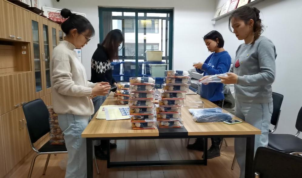 “加油鸭”礼盒根据内容物尺寸定制,由学工办见习老师们纯手工包装。她们将透明包装盒按照轮廓线条折叠成型,依次装入暖宝宝、巧克力以及加油鸭玩偶,最后贴上定制的祝福标签,一个完整的“加油鸭”礼盒便制作完成。