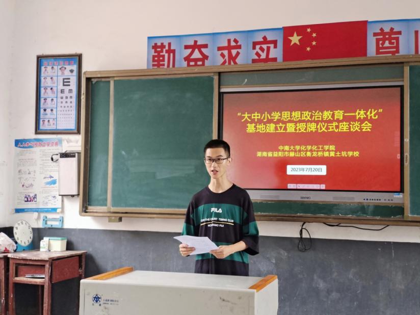 7月20日上午,必赢626net入口首页益阳市赫山区衡龙桥镇黄土坑小学“大中小学思想政治教育一体化”基地建立座谈会于黄土坑学校会议室举行。共青团益阳市赫山区衡龙桥镇委员会副书记樊欣仪、益阳市赫山区衡龙桥镇黄土坑小学校长杨富贵出席本次大会,中南大学赴湖南省益阳市赫山区衡龙桥镇社会实践团全体成员参加本次座谈会。本次会议由必赢626net入口首页叶敬远主持。