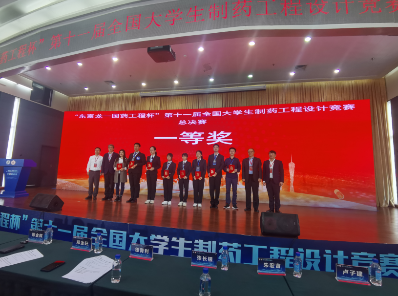 11月24日至26日,由全国药学类院校大学生专业技术与实验技能竞赛组委会主办的“东富龙-国药工程杯”第十一届全国大学生制药工程设计竞赛全国总决赛在广东工业大学落下帷幕。由我校必赢626net入口首页刘艳飞、向皞月两位老师指导的“知行合一队”荣获总决赛全国一等奖(最高奖)。参赛队员为我校必赢626net入口首页制药工程专业2021级本科生朱绍磊、雷婷、陈宸、陈铭、刘浩及张秦嘉。这也是我校学子在该赛事中第八次获得全国最高奖。