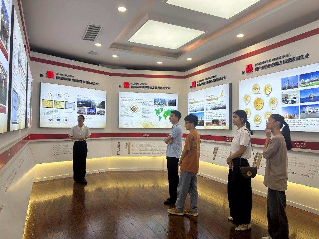 座谈会后,实践团师生跟随工作人员前往一楼展厅,进一步了解了东明石化三十余年风雨兼程的辉煌历程。随后,师生前往东明石化旗下劲海石化工业园区内进行参观,在控制室内,大型的监控屏以及操作台阵列让同学们感到震撼,工作人员细致解读了各类聚乙烯、聚丙烯的实际应用,令师生深切体会到化学工业对现代生活的影响无处不在。
