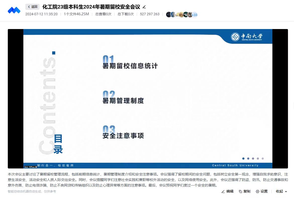2024年暑假即将来临,根据学校和学院相关要求部署,为切实做好暑假期间及放假前后学院各项安全工作,保障全院师生安全,确保校园安全稳定,7月9日-12日,学院本科生、研究生各年级于线上、线下先后召开暑假安全工作会议。学院学工办全体辅导员、安全干事组织,全院全体同学参加。