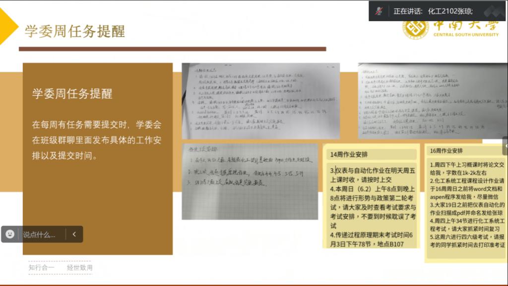 年级长述职后,各班长进行述职,各班班长对本班学习情况、重点学生情况、班级个人规划、大四班委换届摸底等方面进行分析,同时进行未来展望。为了帮助同学们大四顺利毕业,化工2102班开展学委周任务提醒,学委将每周需要上交的作业、需要完成的任务等在班级群中发通知提醒,以防同学们因作业忘交等情况而挂科,对其他班级具有借鉴意义。同时,辅导员关心各班班委换届进展,根据各班情况提出指导意见。