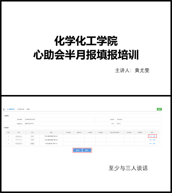 这次培训会议不仅全面讲解了系统的操作指南以及填报的具体要点,而且对心理委员的工作进行了规范,引导大家认真开展半月报工作,对同学们的心理健康状况进行全面排查,力所能及地为同学们提供帮助,保障和维护同学们的心理健康。