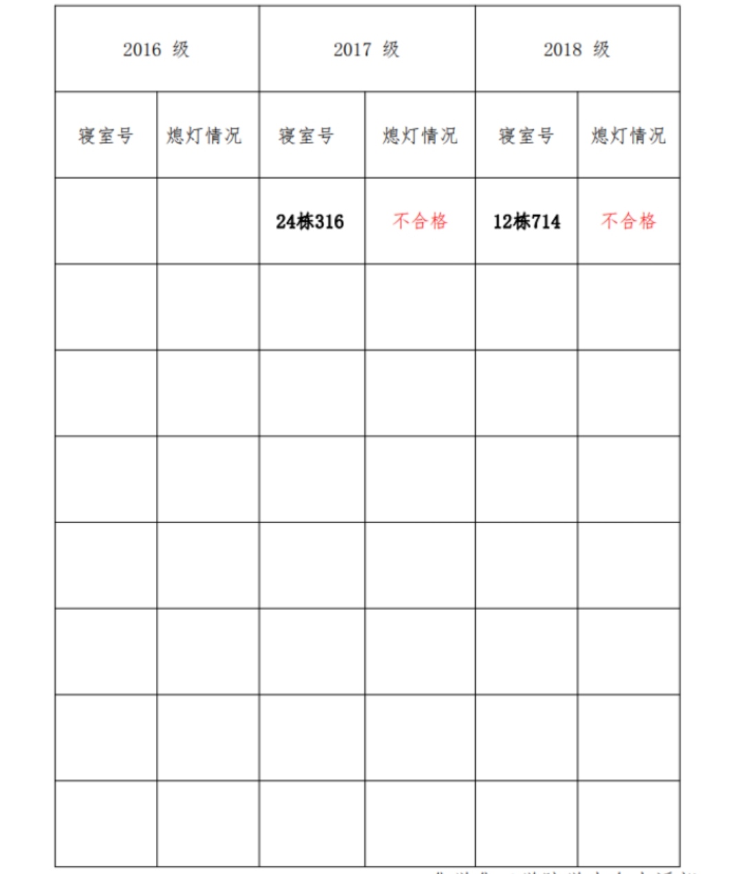 为改正各种不良现象和陋习,增强宿舍学习氛围,营造温馨家园氛围,必赢626net入口首页学生会生活部对三个年级所有寝室进行熄灯检查。本次熄灯情况通报不合格寝室 2 间,具体情况如下:
