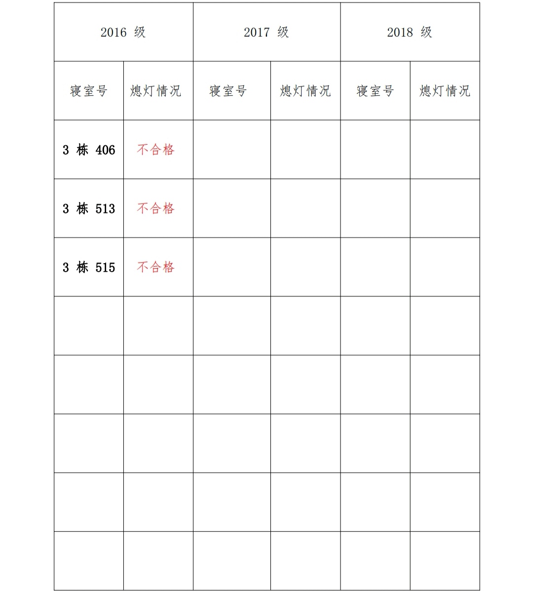 为改正各种不良现象和陋习,增强宿舍学习氛围,营造温馨家园氛围,化学化工学院学生会生活部对三个年级所有寝室进行熄灯检查。本次熄灯情况通报不合格寝室 3 间,具体情况如下: