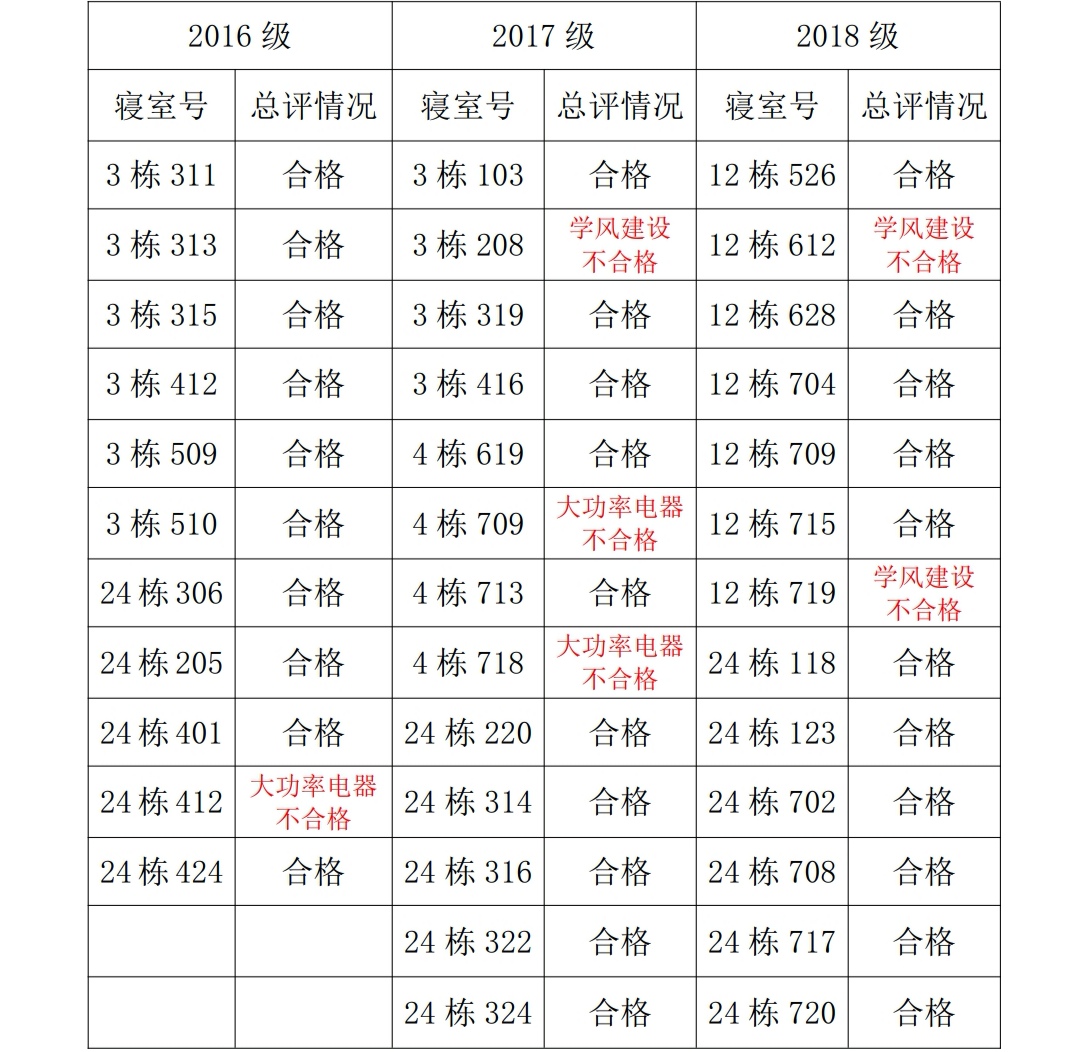 为改正各种不良现象和陋习,增强宿舍学习氛围,营造温馨家园氛围,必赢626net入口首页学生会生活部对三个年级部分寝室进行检查。本次查寝共检查寝室数37 间,6 间寝室不合格。所查寝室总评情况如下: