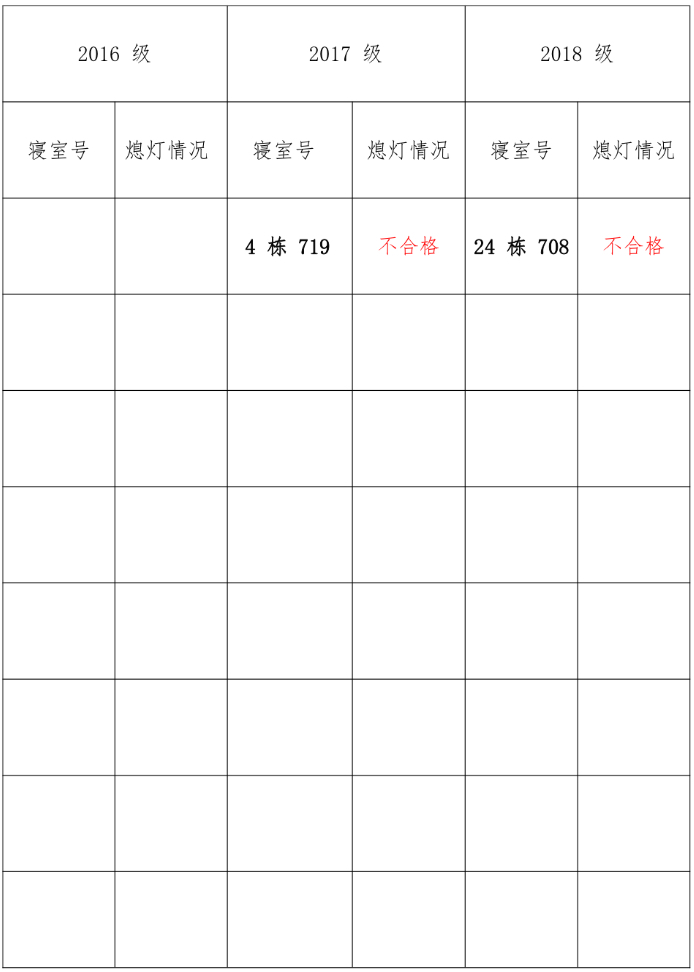 为改正各种不良现象和陋习,增强宿舍学习氛围,营造温馨家园氛围,化学化工学院学生会生活部对三个年级所有寝室进行熄灯检查。本次熄灯情况通报不合格寝室 2 间,具体情况如下: