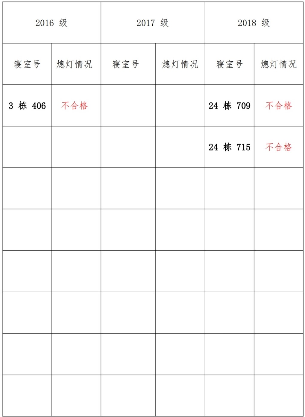 为改正各种不良现象和陋习,增强宿舍学习氛围,营造温馨家园氛围,化学化工学院学生会生活部对三个年级所有寝室进行熄灯检查。本次熄灯情况通报不合格寝室 3 间,具体情况如下: