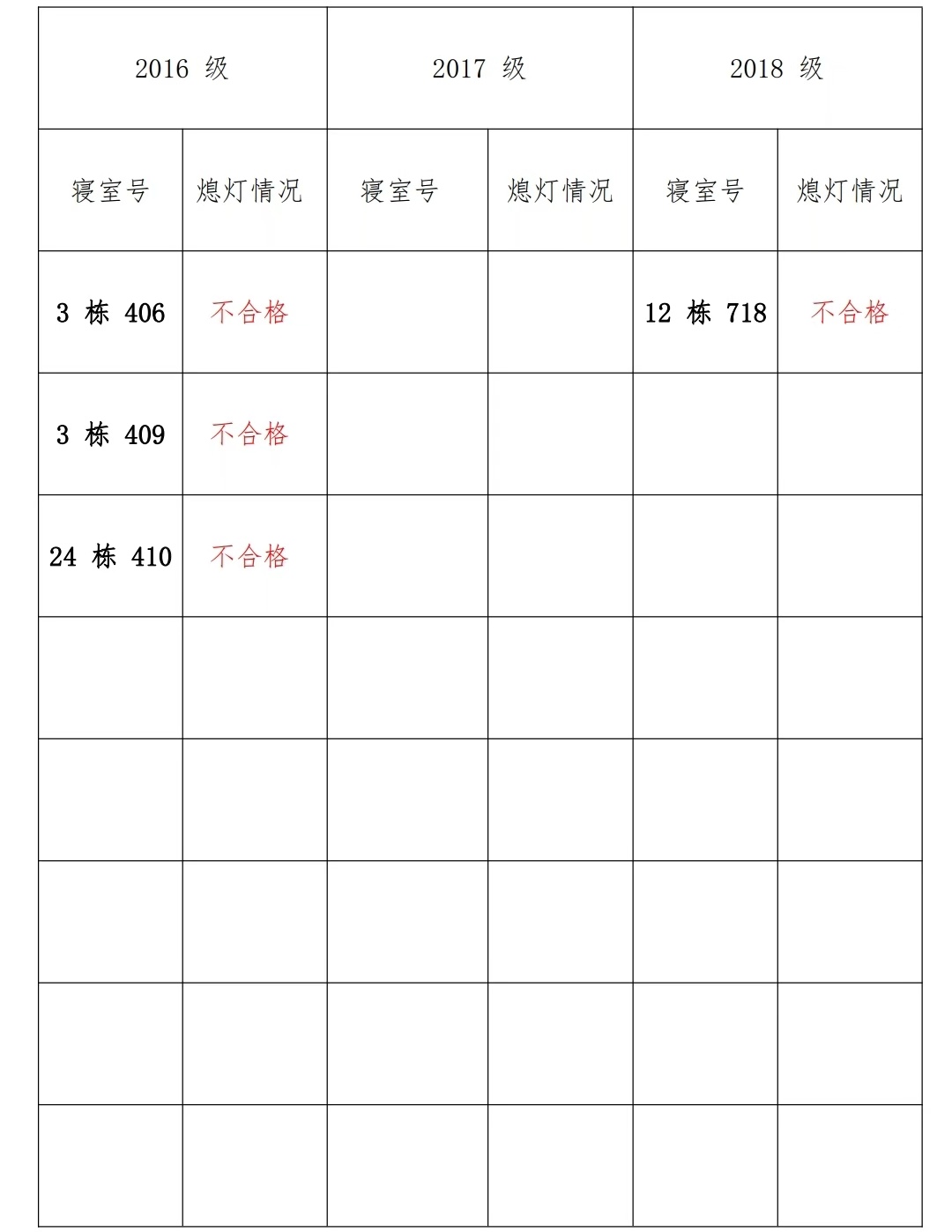 为改正各种不良现象和陋习,增强宿舍学习氛围,营造温馨家园氛围,必赢626net入口首页学生会生活部对三个年级所有寝室进行熄灯检查。本次熄灯情况通报不合格寝室 4 间,具体情况如下: