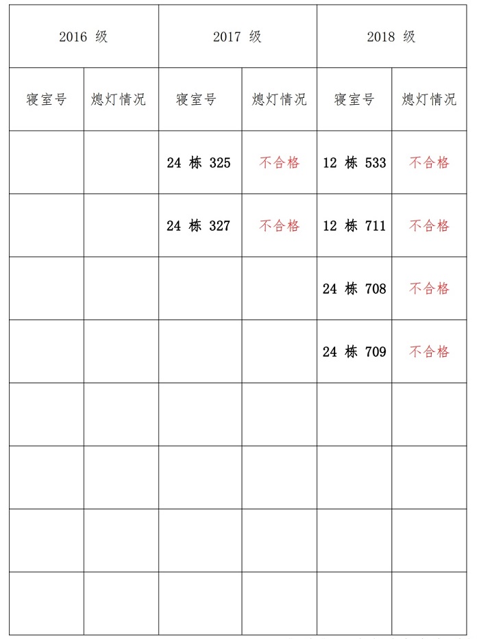 为改正各种不良现象和陋习,增强宿舍学习氛围,营造温馨家园氛围,必赢626net入口首页学生会生活部对三个年级所有寝室进行熄灯检查。本次熄灯情况通报不合格寝室 6 间,具体情况如下: