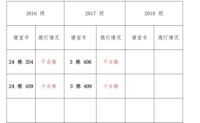 为改正各种不良现象和陋习,增强宿舍学习氛围,营造温馨家园氛围,必赢626net入口首页学生会生活部对三个年级所有寝室进行熄灯检查。本次熄灯情况通 报不合格寝室 4 间,具体情况如下: