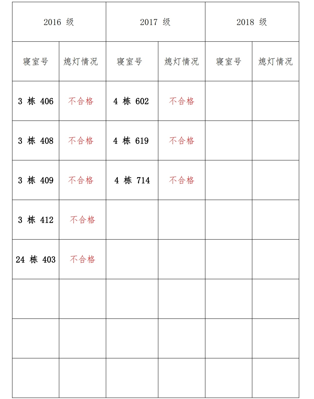 为改正各种不良现象和陋习,增强宿舍学习氛围,营造温馨家园氛围,化 学化工学院学生会生活部对三个年级所有寝室进行熄灯检查。本次熄灯情况通 报不合格寝室 8 间,具体情况如下: