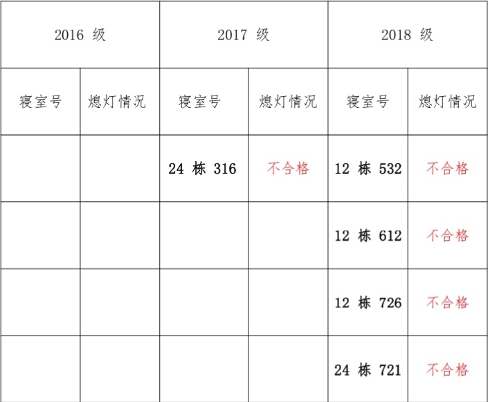 为改正各种不良现象和陋习,增强宿舍学习氛围,营造温馨家园氛围,必赢626net入口首页学生会生活部对三个年级所有寝室进行熄灯检查。 本次熄灯情况通报不合格寝室 5 间,具体情况如下: