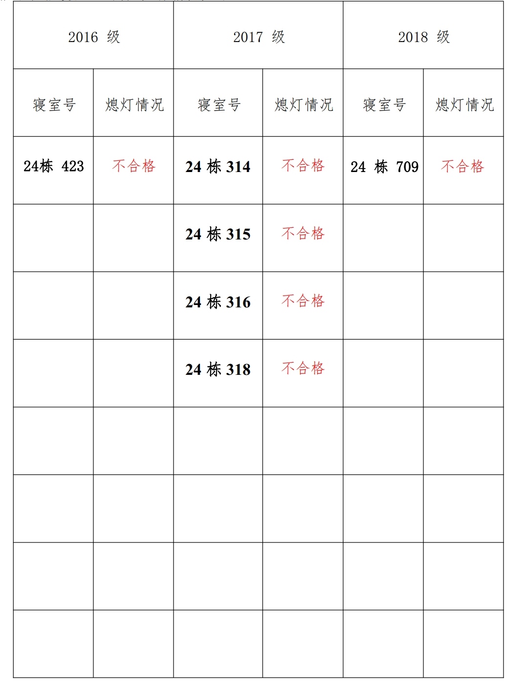 为改正各种不良现象和陋习,增强宿舍学习氛围,营造温馨家园氛围,必赢626net入口首页学生会生活部对三个年级所有寝室进行熄灯检查。 本次熄灯情况通报不合格寝室 6 间,具体情况如下: