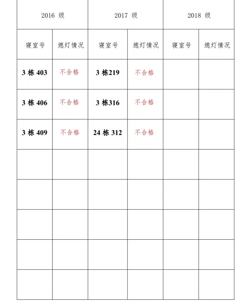 为改正各种不良现象和陋习,增强宿舍学习氛围,营造温馨家园氛围,必赢626net入口首页学生会生活部对三个年级所有寝室进行熄灯检查。 本次熄灯情况通报不合格寝室 6 间,具体情况如下: