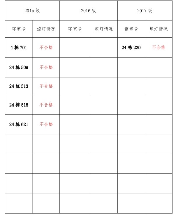 为改正各种不良现象和陋习,增强宿舍学习氛围,营造温馨家园氛围,必赢626net入口首页团委学生会生活权益服务部对三个年级所有寝室进行熄灯检查。本次熄灯情况通报不合格寝室6间,具体情况如下: