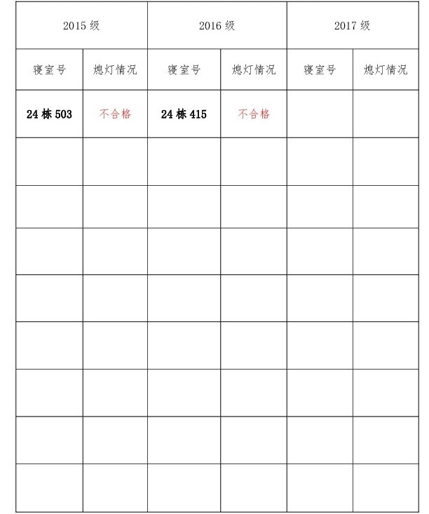 为改正各种不良现象和陋习,增强宿舍学习氛围,营造温馨家园氛围,必赢626net入口首页团委学生会生活权益服务部对三个年级所有寝室进行熄灯检查。本次熄灯情况通报不合格寝室2间,具体情况如下: