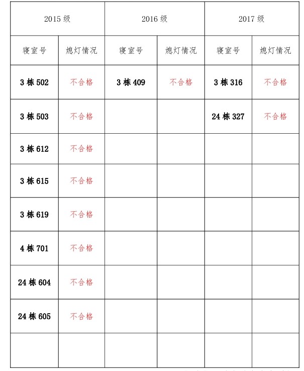 为改正各种不良现象和陋习,增强宿舍学习氛围,营造温馨家园氛围,必赢626net入口首页团委学生会生活权益服务部对三个年级所有寝室进行熄灯检查。本次熄灯情况通报不合格寝室11间,具体情况如下: