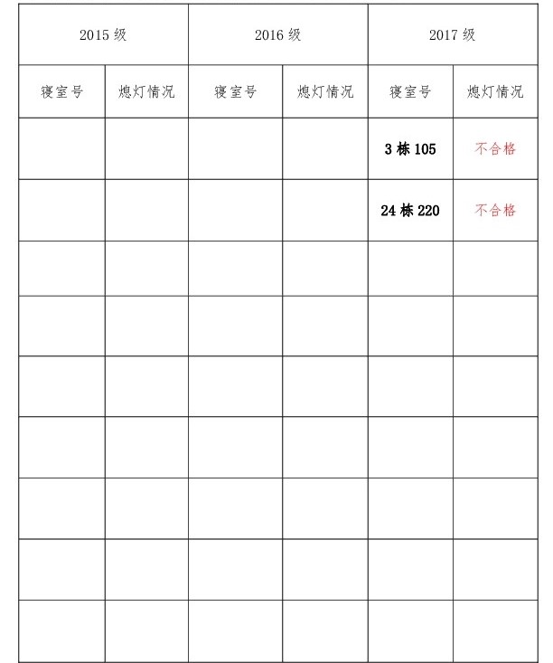 为改正各种不良现象和陋习,增强宿舍学习氛围,营造温馨家园氛围,必赢626net入口首页团委学生会生活权益服务部对三个年级所有寝室进行熄灯检查。本次熄灯情况通报不合格寝室2间,具体情况如下: